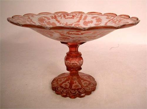 A GROUP OF THREE ACID ETCHED CRANBERRY TO CLEAR COMPOTES; Animal and foliate motif 10"dia 6 1/4"h