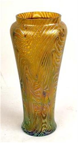 Comprising, a jack-in-the-pulpit, a cobalt and applied gilt decorated dolphin-motif vase, and a amber opalescent glass tall vase, 12"h