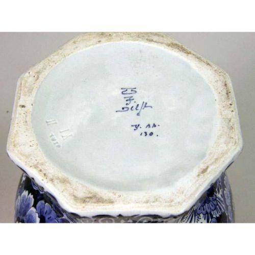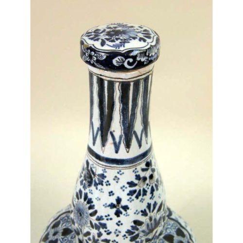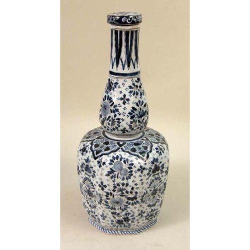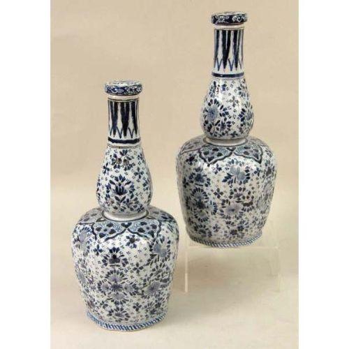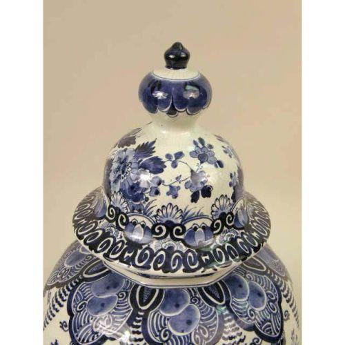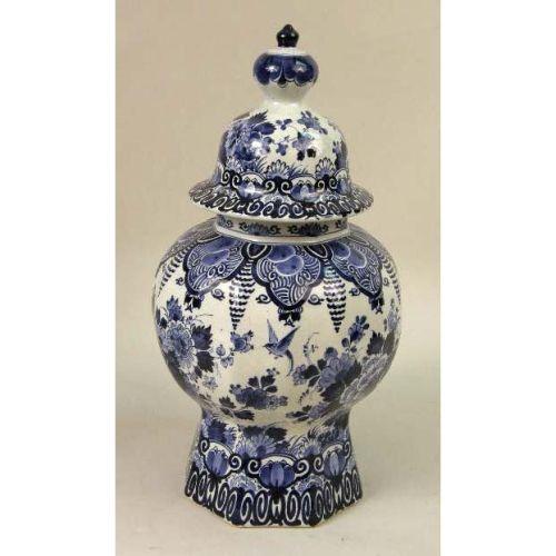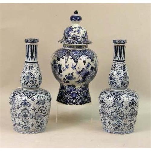 A GROUP OF THREE BLUE AND WHITE DELFT TABLE ARTICLES<BR><BR>Including, a pair of jars with stoppers and baluster form vase with bell cover, losses, chips and cracks, 13-1/2"h