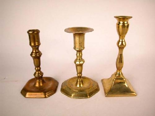 A GROUP OF THREE BRASS AND BELL METAL CANDLESTICKS, ENGLISH; Tallest 7"h