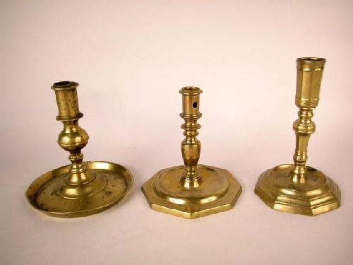 A GROUP OF THREE BRASS CANDLESTICKS, CONTINENTAL; Two with octagonal bases and one with a round base 6"h