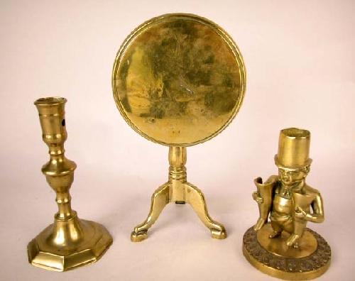 A GROUP OF THREE BRASS CANDLESTICKS; including an octagonal base acorn rope candlestick, 7"h