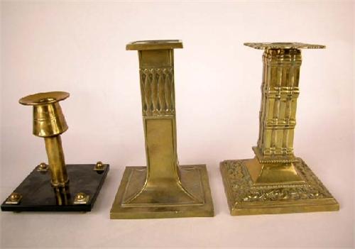 A GROUP OF THREE BRASS CANDLESTICKS; Including a Continental candlestick, marked "W.T. & S." with a sun, cast with dolphins on base and bobeche, 6.5"h