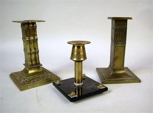 Including a Continental candlestick, marked "W.T. & S." with a sun, cast with dolphins on base and bobeches, 6 1/2"h.