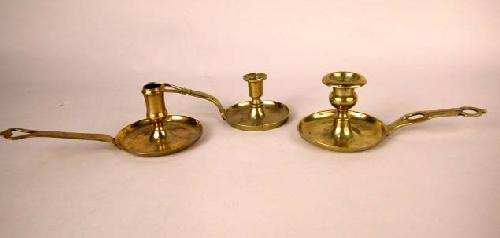 A GROUP OF THREE BRASS CHAMBERSTICKS; Longest 9"l