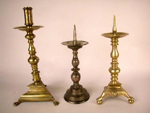 A GROUP OF THREE BRASS SINGLE CANDLESTICKS; Tallest 14"h