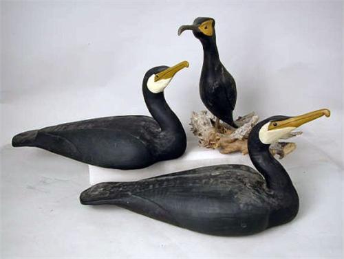 A GROUP OF THREE CARVED AND PAINTED CORMORANT DECOYS; Two nearly identical, by Clarence and Barbara Fenimore, New Jersey, and a third stick-up example, wear, 3 pieces