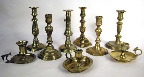 tallest measures 3-3/4"h, Together with a group of three brass and bell metal candlesticks, English, Together with a group of three brass candlesticks, English