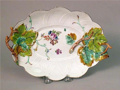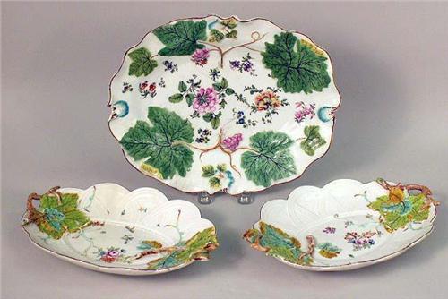 Comprising a pair of dishes formed as shallow scalloped oval baskets and an oval dish painted with flowers and molded around the rim, the second with red anchor mark. Some restoration and wear. Largest 12 1/2"l.