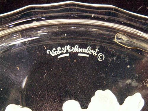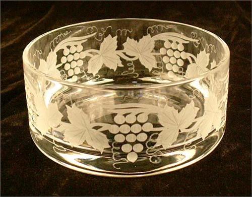 With etched fruit motif, marked "Val St. Lambert," Together with four coasters with an etched grape motif, marked William Yeoward, From 5 3/4"dia. and 4 1/4"dia.