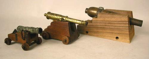 A GROUP OF THREE DIMINUTIVE BRASS CANONS; Imperfections to surface, one with an associated stand (which lacks wheels) 3 pieces