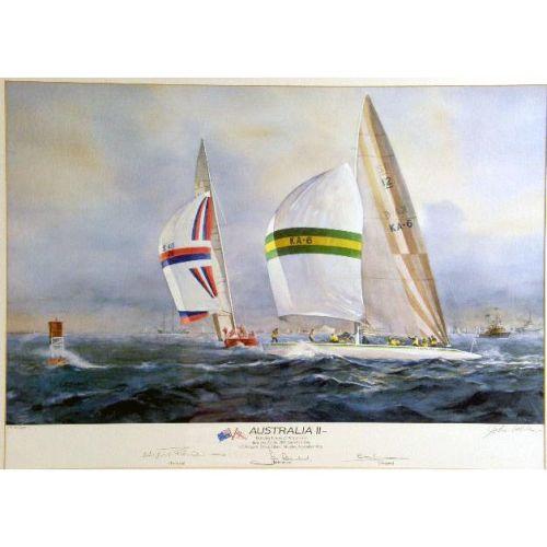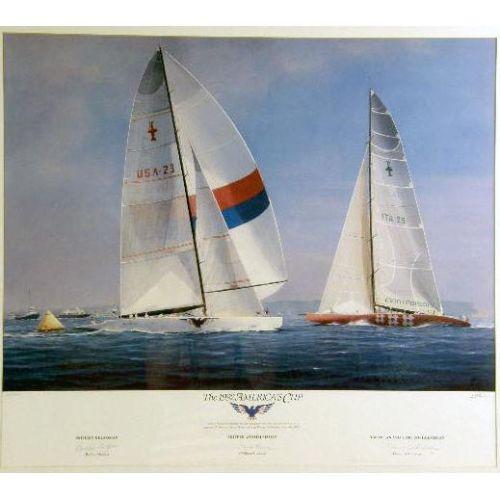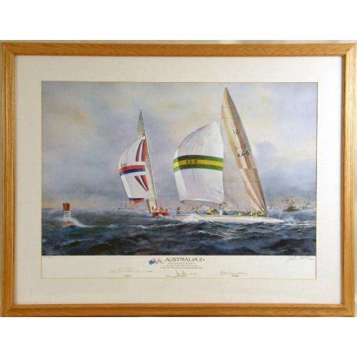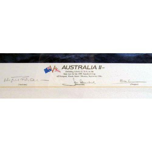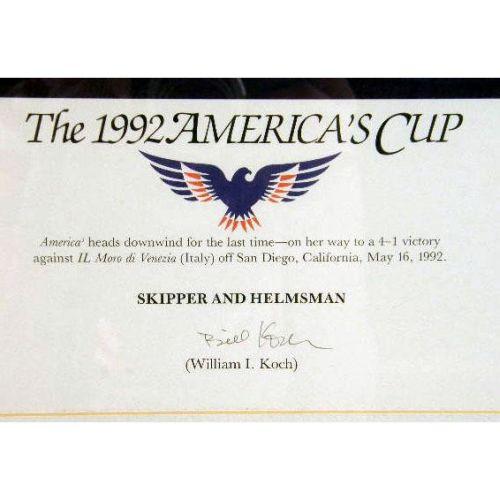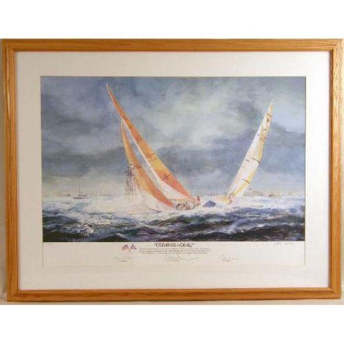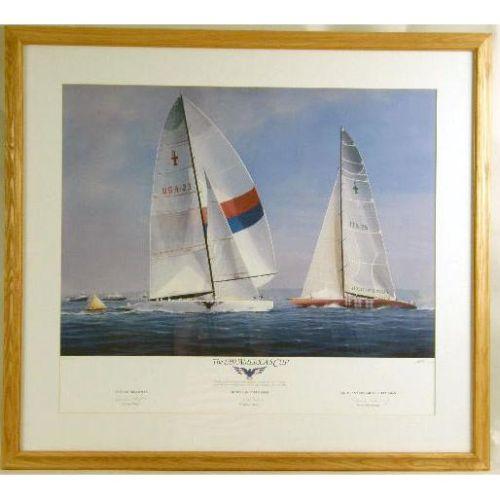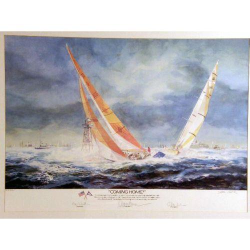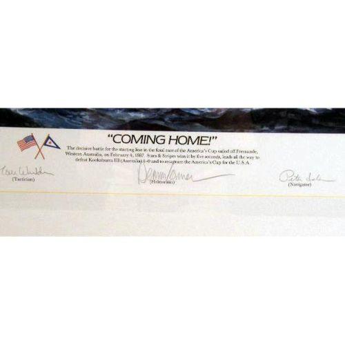 A GROUP OF THREE FRAMED AMERICA`S CUP PRINTS<BR><BR>Comprising, the 1992 America`s Cup, 240-2500 bears signature "Buddy Melges," "William Koch," and "David Dellenbaugh," by Thomson, the Australia II, 1913/2000, signed John Gable, bears signatures of crew, and "Coming Home," 1913/2500, signed by John Gable, and signed by the crew 17-1/4"h x 27-1/4"w