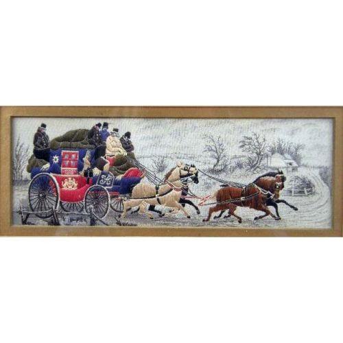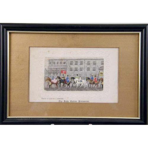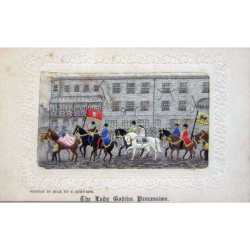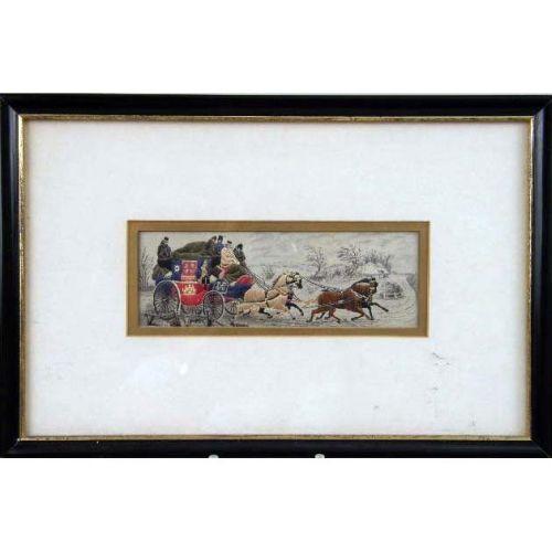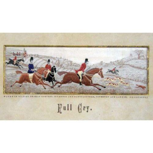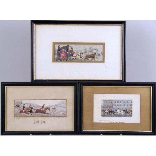 A GROUP OF THREE FRAMED STEVENGRAPHS<BR><BR>Depicting horse scenes, including, one titled "Full Cry," and "The Lady Godiva Procession," Largest: 2"h x 6"w
