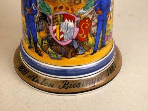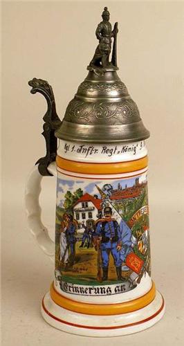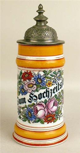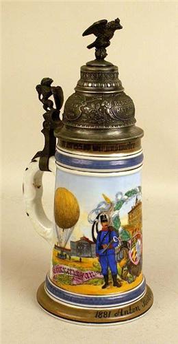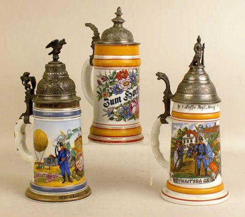 With a pewter hinged lids and thumbpieces, one marked underside Rau Porcelain Factory, Munich Bavaria Germany, another marked underside, Made in Western Germany and handpainted, 10"h, 11"h and 10 1/2"h