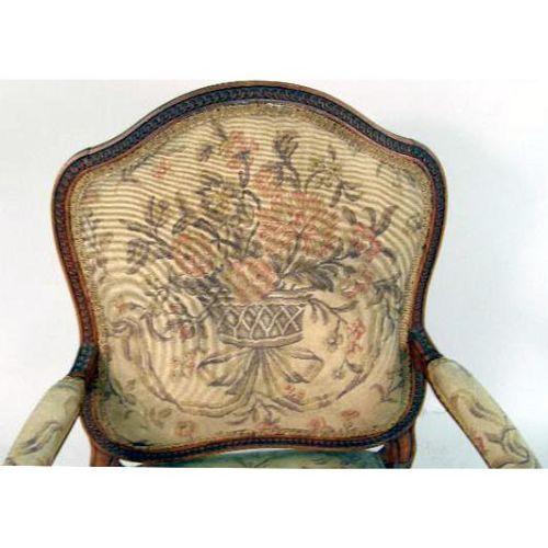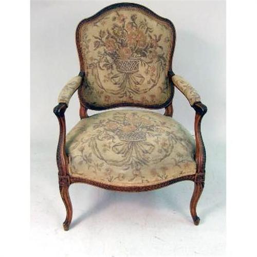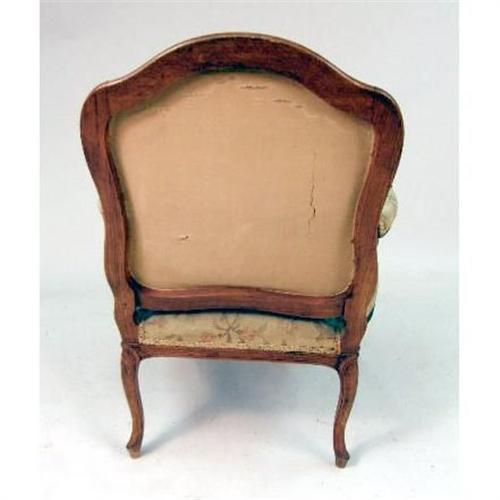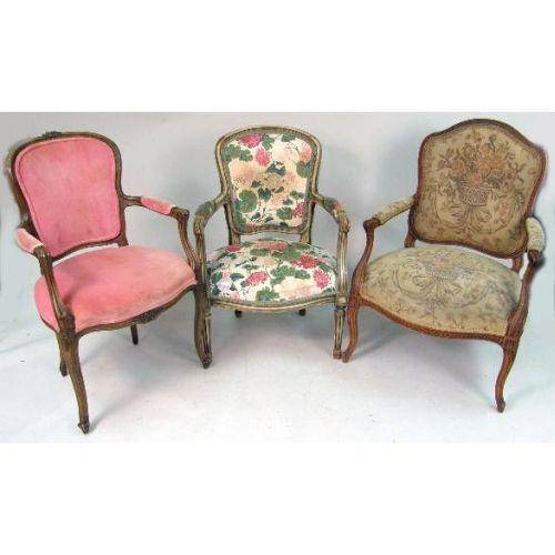 A GROUP OF THREE LOUIS XV- AND LOUIS XVI-STYLE CHAIRS, comprising two Louis XV-style bergeres, and a Louis XVI-style walnut needlepoint upholstered open bergere.<BR><BR>A GROUP OF THREE LOUIS XV- AND LOUIS XVI-STYLE CHAIRS, comprising two Louis XV-style bergeres, and a Louis XVI-style walnut needlepoint upholstered open bergere.