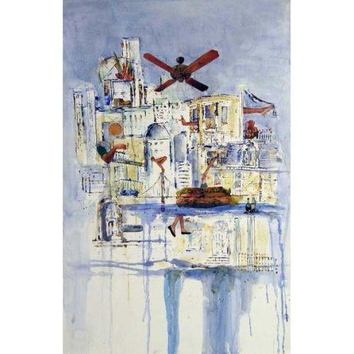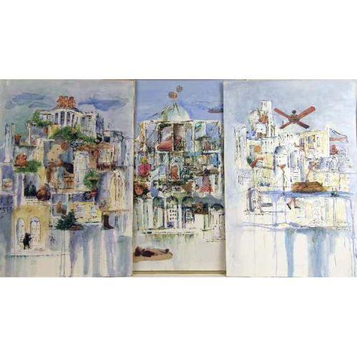 A GROUP OF THREE MIXED MEDIA<BR><BR>Depicting surrealist scenes, bears signature Iris Schwartz, 30"h 19-3/4"w