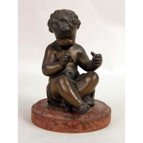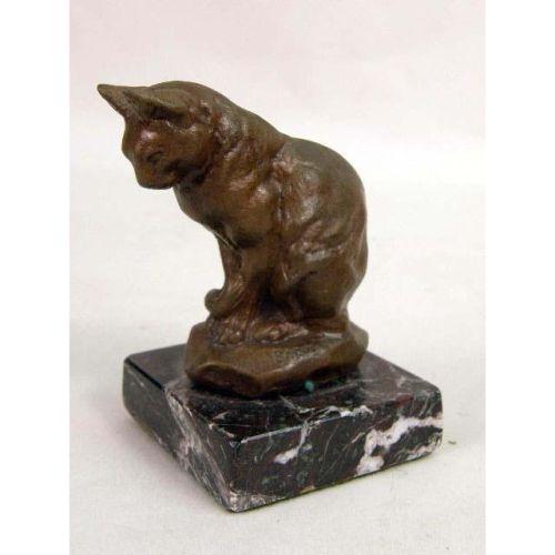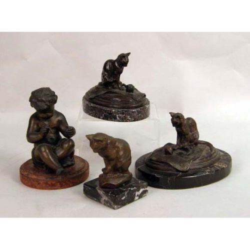 A GROUP OF THREE PATINATED BRONZE CAT FIGURALS<BR><BR>One signed Barye, largest, 5"l, together with a patinated metal figural of a putto 4 pieces