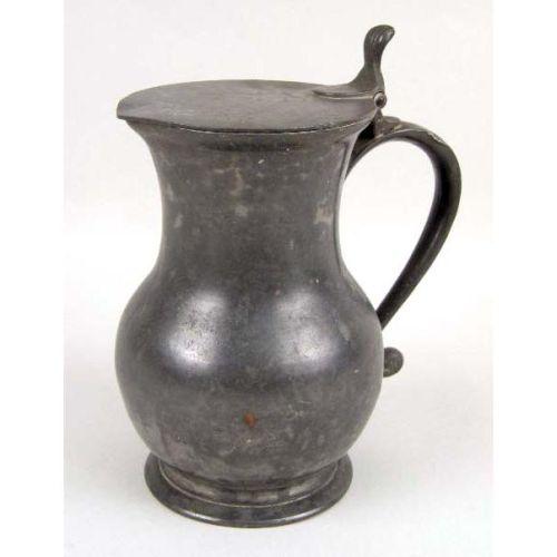 A GROUP OF THREE PEWTER TABLE ARTICLES<BR><BR>including two tankards, one monogrammed FGT 1795, and the other IL. Together with a hinged covered pitcher, maker`s mark illegible, and a white metal repousse tankard. Tallest 8 3/4"h. 4 pieces