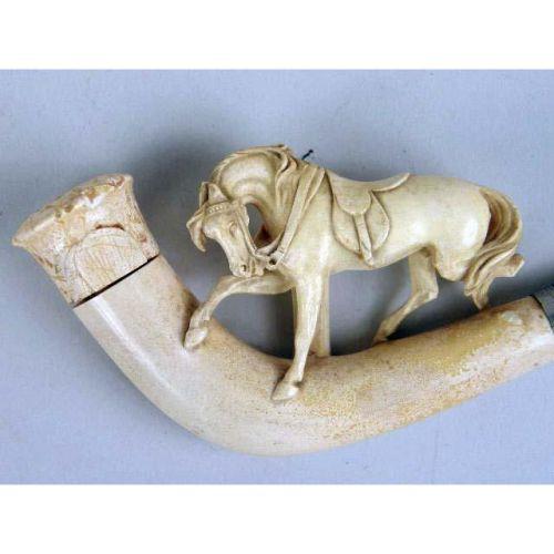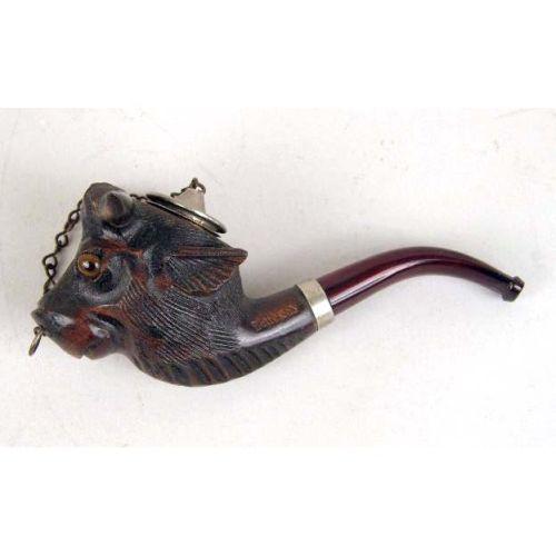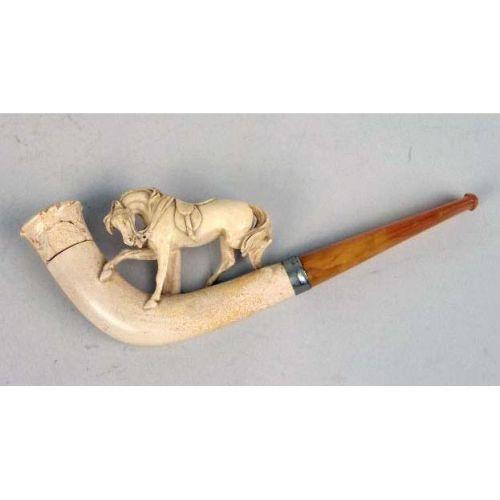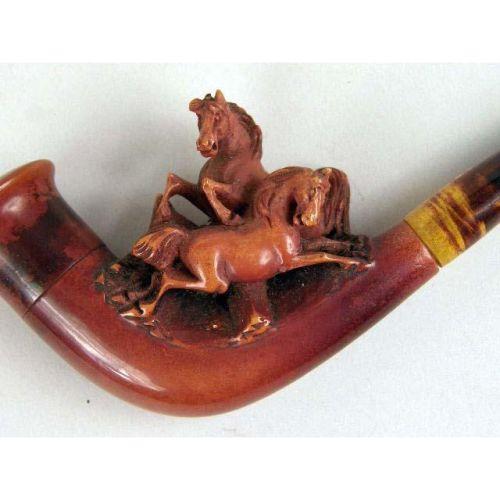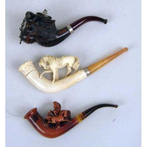 A GROUP OF THREE PIPES<BR><BR>including two meerschaum examples with a horse motif, and a bull marked "Bullshead". Losses. 7"l