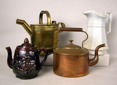 A GROUP OF THREE TEAPOTS; One Rockingham, one brass, one copper, and an ironstone pitcher (losses) Tallest: 10 1/2"h