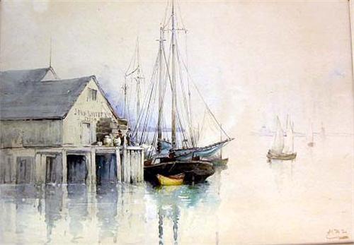A GROUP OF THREE WATERCOLORS; Two depicting sailboats at dockside and one depicting a landscape with a stream and bridge Largest: 28" x 22" (losses)