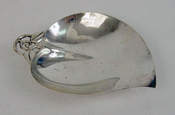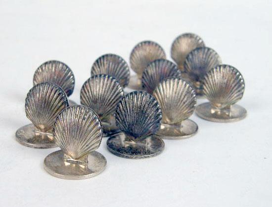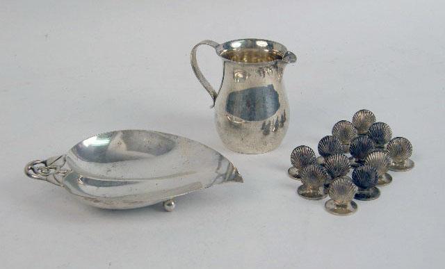 Comprising a cream jug #323322, a leaf-form footed dish #22825, and a set of twelve shell-form place card holders, total weight apx. 11 T.O. 3"h, 6"l and 1"h, respectively