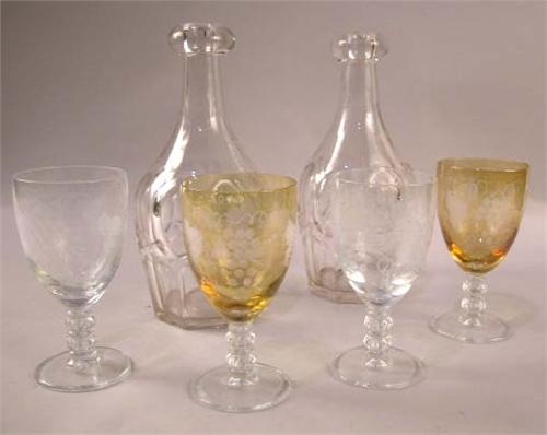 A GROUP OF TWELVE ACID-ETCHED GRAPEVINE MOTIF WINE GLASSES; Together with a pair of colorless glass un-stoppered decanters.