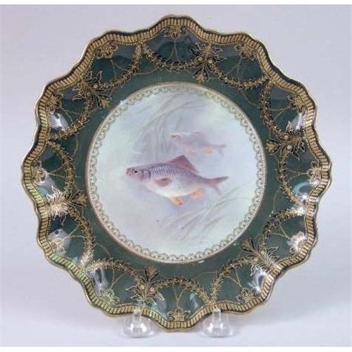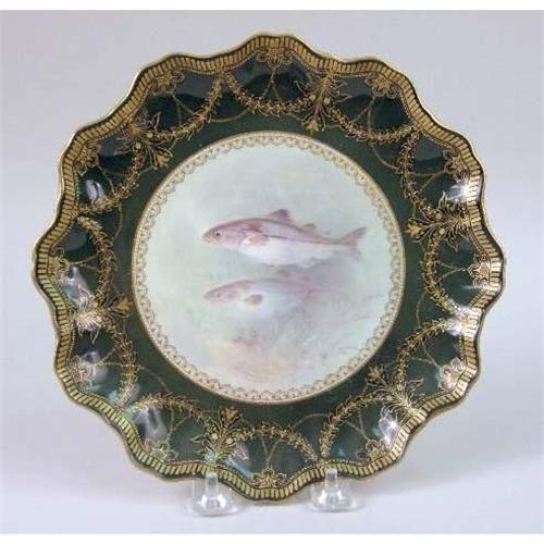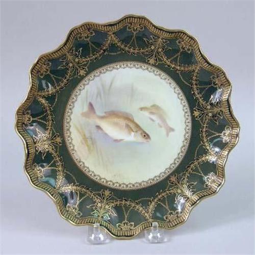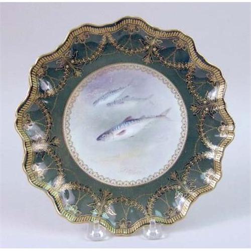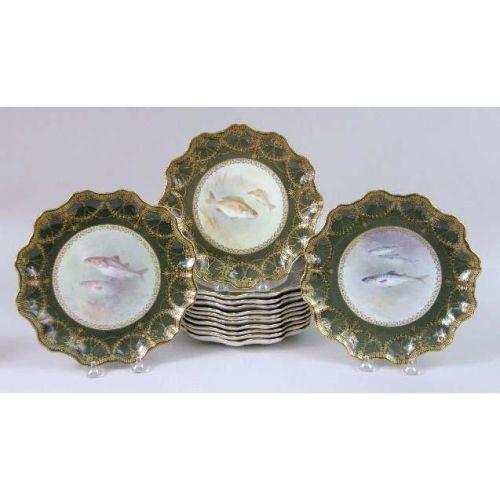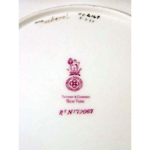 A GROUP OF TWELVE PORCELAIN POLYCHROME AND PARCEL-GILT DECORATED FISH PLATES<BR><BR>Marked "Royal Daulton, No. 72067," retailed by Tiffany & Co., New York. Together with two similar plates, losses, 9"dia. 14 pieces