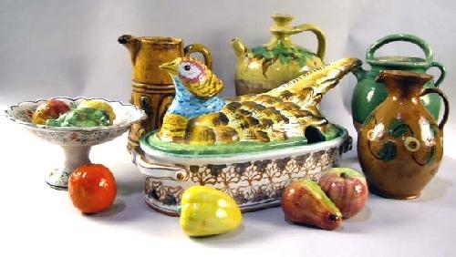 A GROUP OF TWENTY ASSORTED EARTHENWARE TABLE ARTICLES; including covered tureens, pitchers, crocks, compotes and fruit.