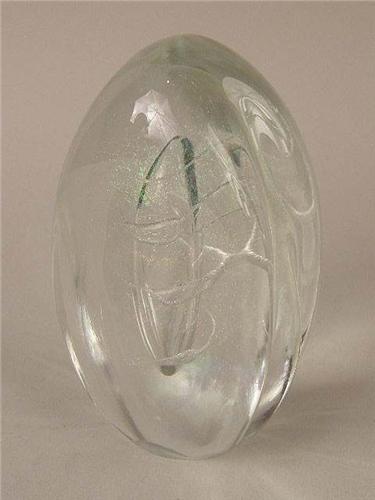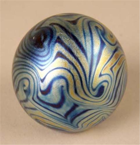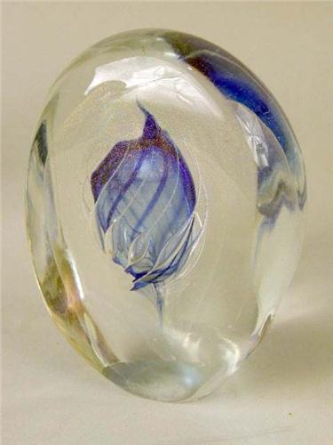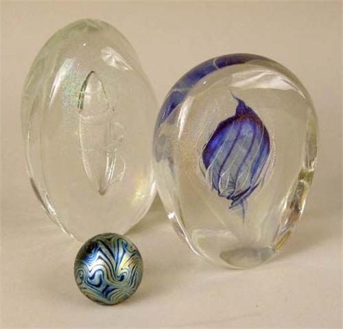 Together with an iridescent glass paperweight. All marked "Eickholt,"