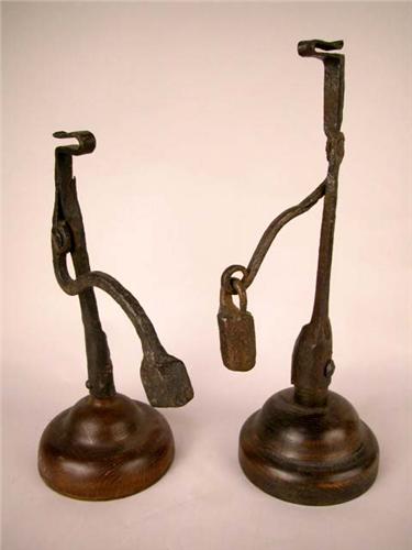 A GROUP OF TWO WEIGHTED RUSH LIGHTS ON WOOD STANDS, CONTINENTAL