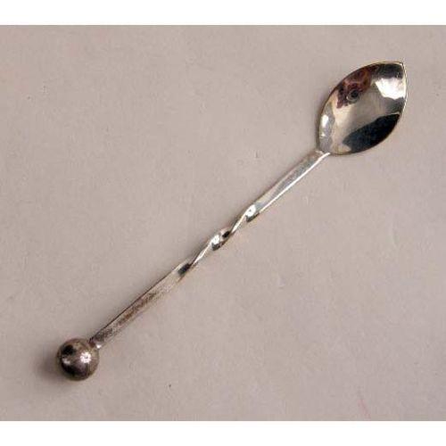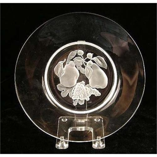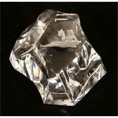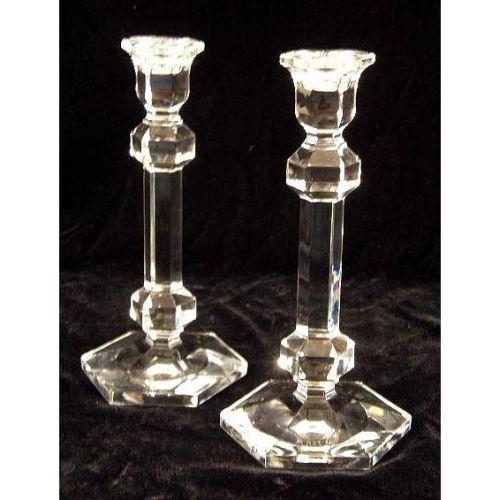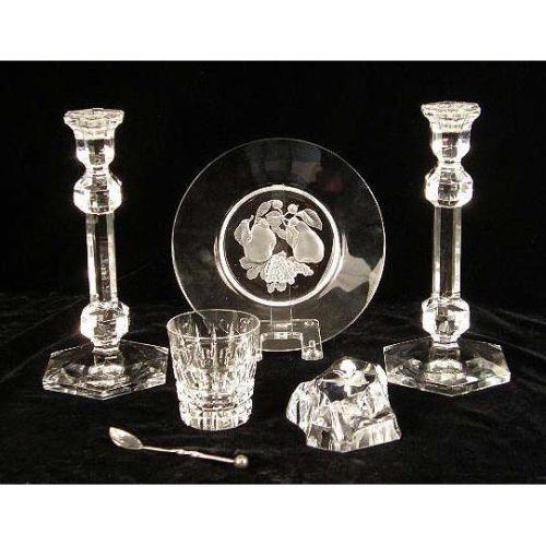 A GROUP OF VAL ST. LAMBERT COLORLESS GLASS TABLE ARTICLES<BR><BR>Comprising, a dish, a paperweight, and a pair of candlesticks. Together with a glass marked Hawkes, and a silver plated spoon, scratches and wear, 6 pieces