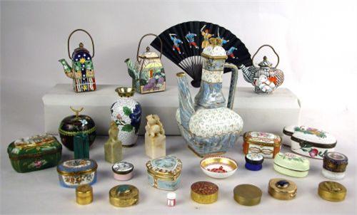 A GROUP OF VANITY TOP ARTICLES; Comprising, enamel decorated hinged boxes, vases, and teapot