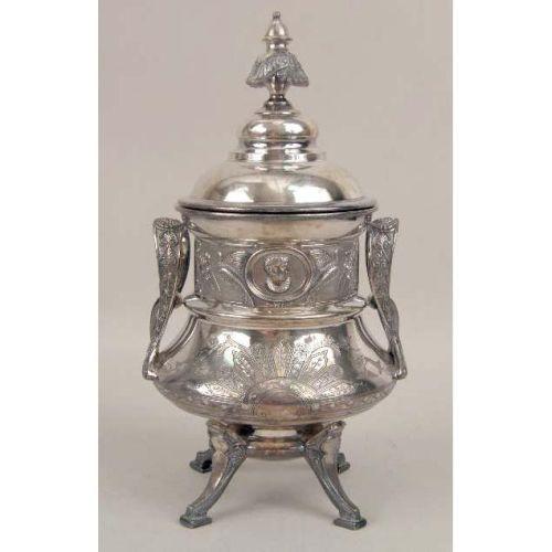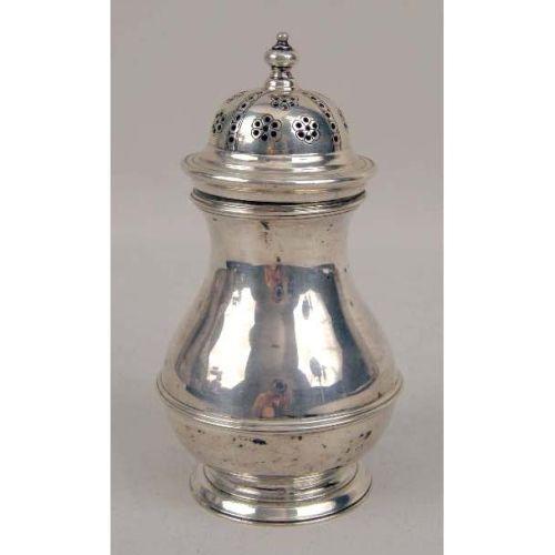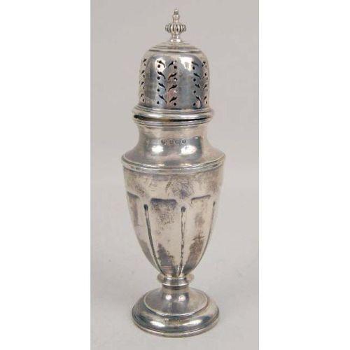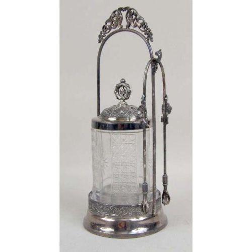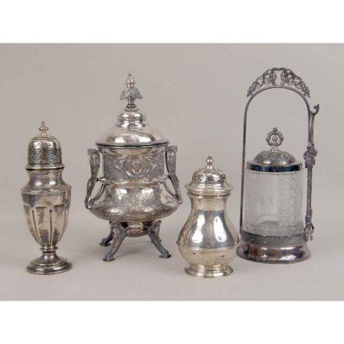 A GROUP OF VICTORIAN SILVER ITEMS<BR><BR>Comprising: an English silver sugar caster, London, maker`s marks JBC & S Ltd., 6"h, a Birmingham silver caster, maker`s marks, S & C Ld., 7-3/4"h, a Victorian silver-plated pickle caster with original glass jar and tongs, 10-1/2"h, a glass and silver mounted cider jug, 10"h, and a covered footed sugar. 5 pieces