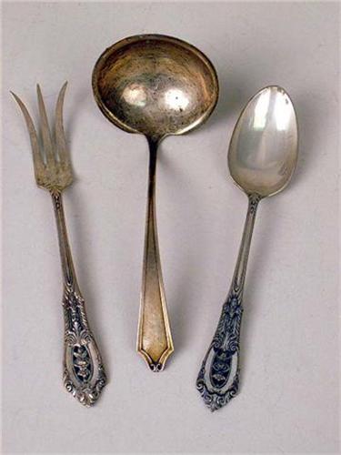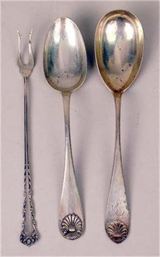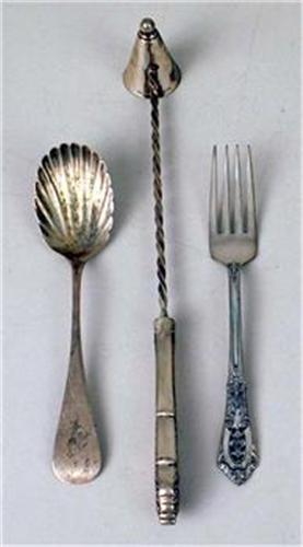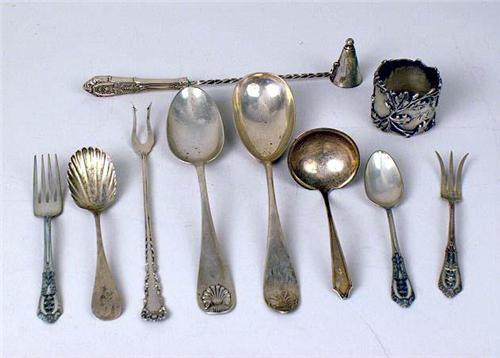 Comprising a three piece youth set, a candle snuffer, and a lemon fork. Together with a Webster condiment fork, an International sterling silver sauce ladle, a Stowell & Co. sugar shell, a shell handle motif serving spoon, a Towle napkin ring, and a Sto