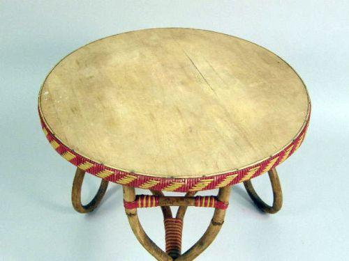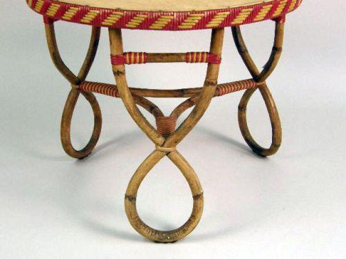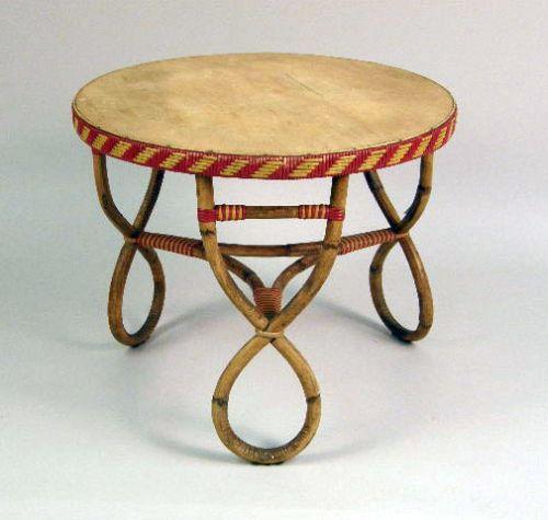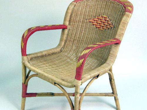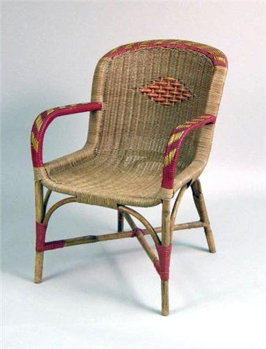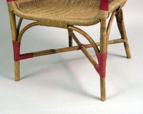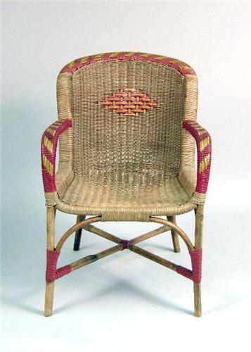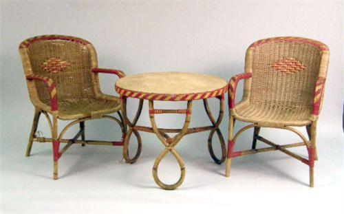 <B>A GROUP OF WICKER FURNITURE</B><BR><BR>Comprising two chairs and a table. 3 pieces. Chairs 33"h x 22-1/2"w, table 24"h x 28"dia. Losses to one chair, table missing top.