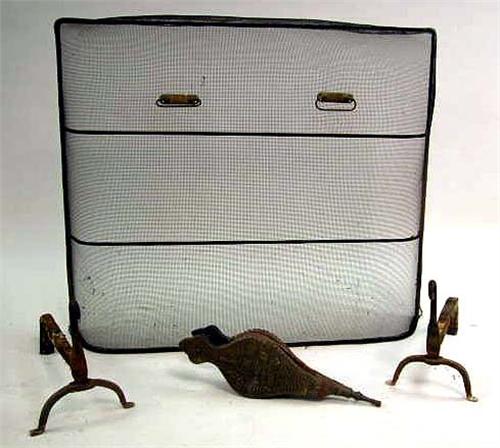 A GROUP OF WROUGHT-IRON HEARTH EQUIPMENT; together with a punched tin bellows, worn, 5 pieces