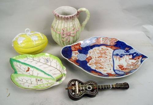A GROUP, PORCELAIN IMARI PLATTER, coral and leaf motif, 16"l, a Stately Homes Mottahedah, Italy leaf-form dish, a pitcher, and an egg-form covered dish