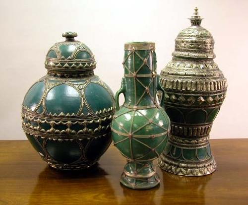 A GROUP THREE METAL MOUNTED CERAMIC HOLLOWWARE;
