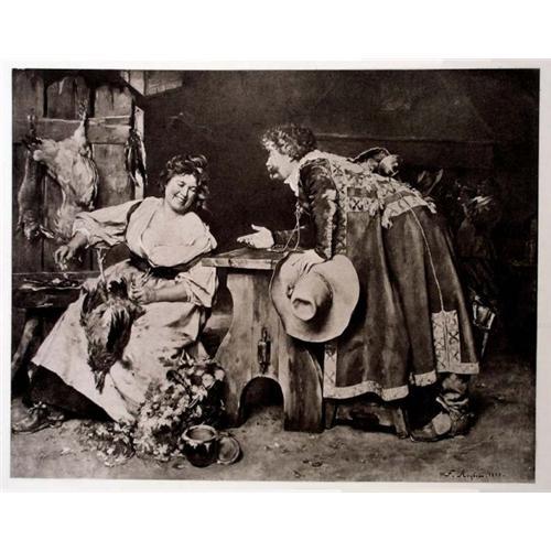 Charming photogravure entitled A Gallant Proposal from the original 1893 painting by F. Roybet. Ferdinand Victor Leon Roybet (1840-1920) was a French School portrait and genre painter who was born in Uzès (Gard) and died in Paris. Roybet received his first training in Lyon, France. He then traveled to Paris where he was a student of Vibert. In the Salon of 1866 he exhibited "Un fou sous Henri III" which was purchased by Princess Mathilde Bonaparte and solidified his career. In 1871 Roybet visited Holland where he studied the works of Rembrandt and Franz Hals. In 1893 he was appointed Chevalier de la Légion de Honneur. His works are in major museums around the world including the Louvre, Metropolitan in NY, Tretiakoff in Moscow, Luxembourg, Boston, Learmont in Montreal, and many others. In very good used condition with minor signs of wear along edges that can be concealed by a passepartout at the time of framing. Please ask questions, request additional photos and shipping costs before buying.