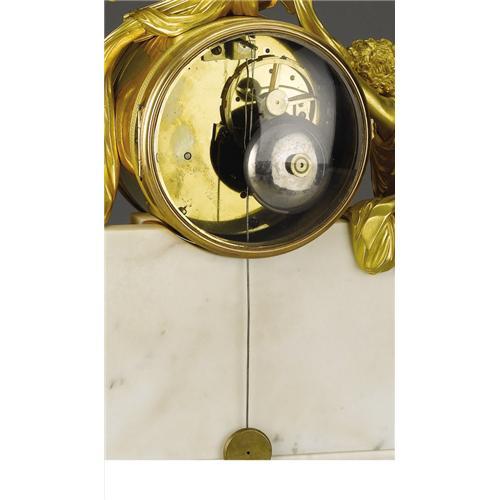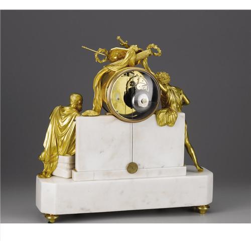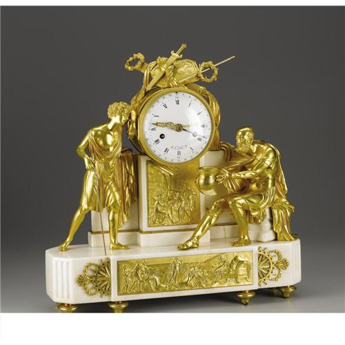 <B>A French Louis XVI Marble and Gilt Bronze Clock</B></I><BR><BR>Attributed to Claude Galle, Paris, France<BR>Circa 1780<BR>Marble and gilt bronze<BR>Unmarked<BR>18 in. high x 18.25 in. wide x 5 in. deep<BR><BR>Depicting the Tragedy of Belisarius, the movement with circular white enamel dial with roman chapters and arabic minute and date rings; flanked by figures of a classically draped youth and an aged beggar, the case surmounted by a military trophy and raised upon a plinth with a relief scene. The whole set upon a white marble shaped base centering a frieze cast and chased with a figural scene; raised on toupee feet.<BR><BR>Belisarius, a general under Justinian, was one of the greatest military commanders of his time and the spearhead of Byzantium's attempts to rebuild the Roman Empire. His very success, however, made him many enemies. Incriminated in a plot against Justinian, his eyes were put out on the Emperor's orders in 561 A.D. According to the historian Procopius, Belisarius, stripped of all his possessions, was reduced to begging in the streets of Byzantium.<BR><BR>A similar example of this clock (with some losses) signed by Claude Galle is housed in the Jerez de la Frontera, Museo de Relojes in Madrid.<BR>