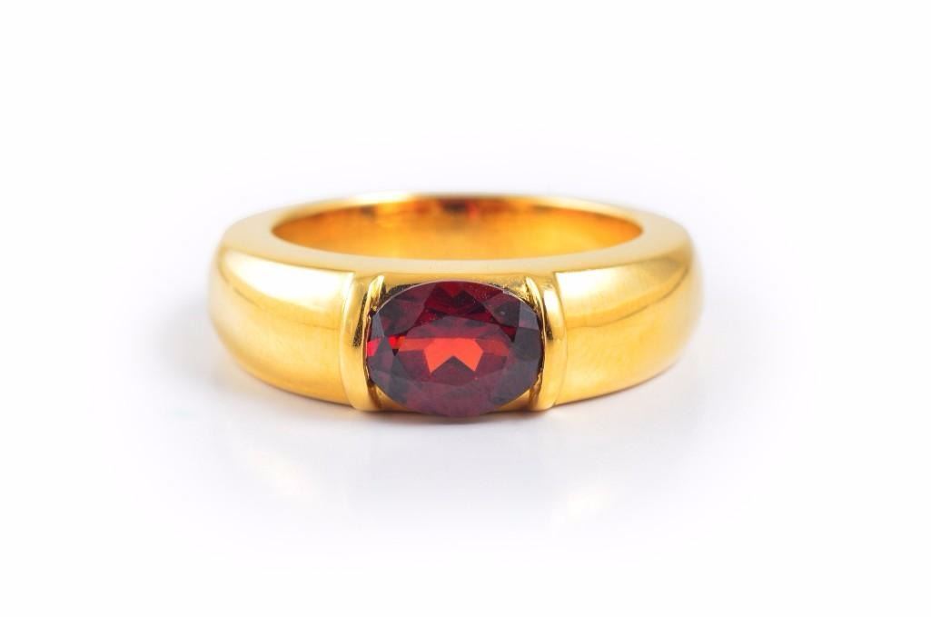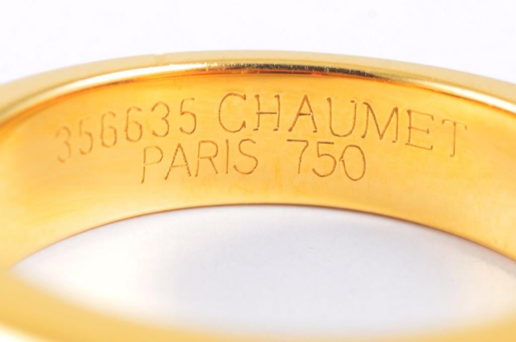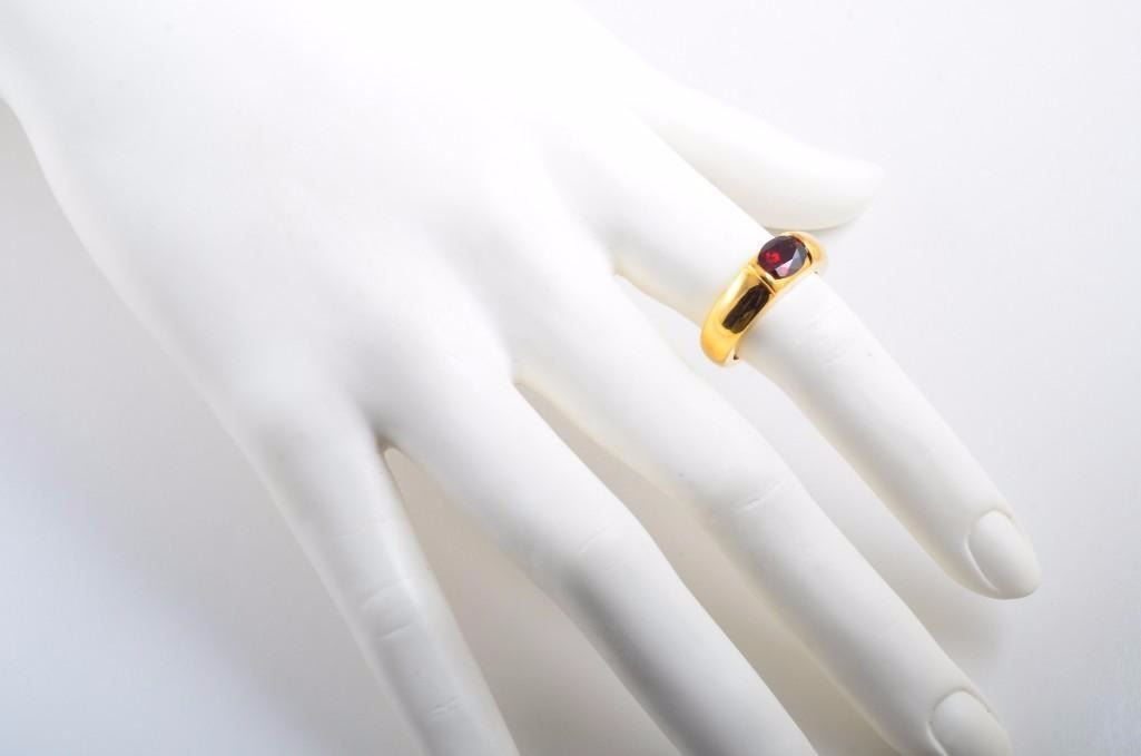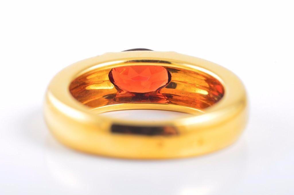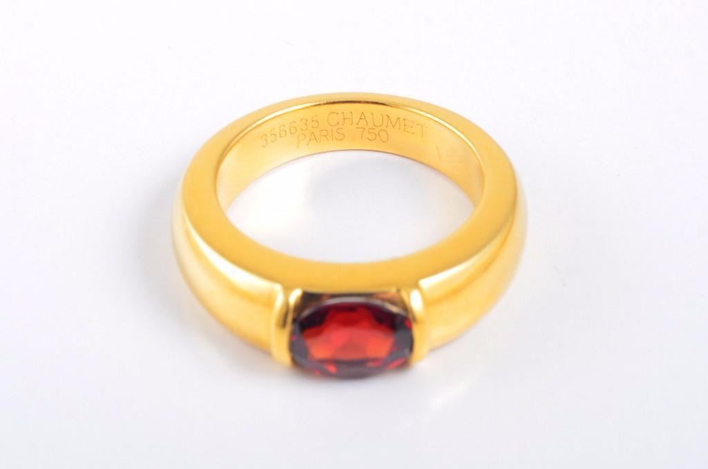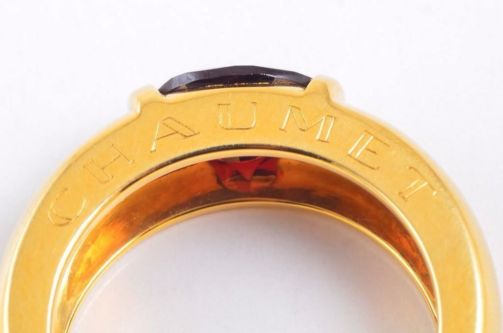 Tension set with a centered spessartite garnet measuring 6.07mm x 7.9mm x 3.98mm, mounted in 18K yellow gold; signed 356635 Chaumet Paris 750; ring size 6-1/2, weight 10g.