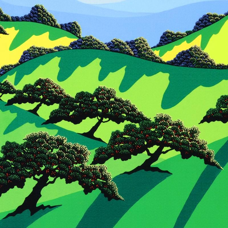 Larissa Holt, a student of distinguished artist Eyvind Earle(1916-2000), uses bold colors and breathtaking scenery to create images of Nature in her own unique style. "A Gathering of Trees" is a limited edition giclee on stretched canvas by Holt, numbered and bearing Holt's authorized signature. This piece comes gallery wrapped with a black border, and is ready to hang. Includes Certificate of Authenticity! Measures approx. 12.5" x 10" x 1.5" (image).
