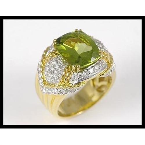 This beautiful lady's 18K yellow gold ring contains with an oval cut green peridot weighing approximately 5.36 carats. 84 full cut diamonds that have an estimated total weight of 1.35 carats are also set on this ring. This size 6 3/4 ring weights 13.70 grams.