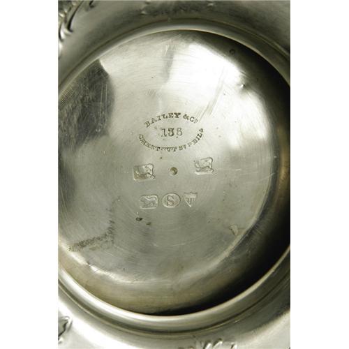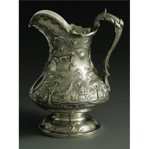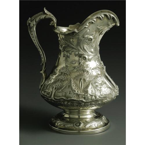 <B>An American Silver Pitcher</B></I><BR>George B. Sharp, Philadelphia, PA, Mid-Nineteenth Century<BR><BR>The scenic repousse pitcher with a commemoration to the front <I>To Annie July 25, 1856,</B></I> hallmark underside with <I>BAILEY & CO. CHESTNUT ST PHILA /136,</B></I> total weight 36 Troy ounces<BR>11in. high