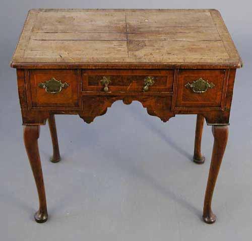 A George I cross banded walnut and herring bone inlaid lowboy, with three drawers over a shaped apron, on cabriole legs and pad feet, later legs, 2ft 9.5ins £800-1,200