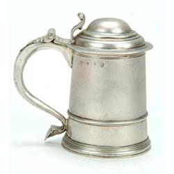 A George I small tankard with a mounded girdle and borders, domed cover with scroll thumb-piece and scroll handle with shaped terminal engraved with initials 'IW' over I*A', the base with a Hancocks & Co label, London 1719 by Timothy Ley, 16cm high overall (6.25 in), 524g (16.75 oz)
