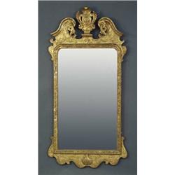 A George I style gilt upright wall mirror, bevelled plate, moulded with leaves on a punched ground, the swan neck cresting with floret and leaf pendant terminals flanking a pierced cartouche, the shaped apron with leaves and central shell, 48in high, 24in wide, 19th century