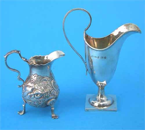 A George II silver cream jug, with scroll handle, decorated with engraved and repousse rococo scrolls, birds and fruit on scroll feet, London 1748 and a helmet shaped cream jug, Birmingham 1905 £120-150