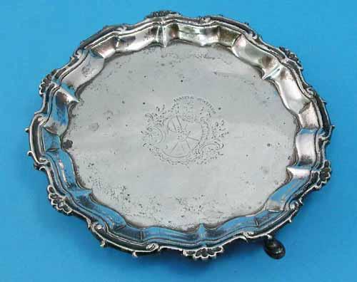 A George II silver waiter, with scroll and shell border and engraved armorial, maker William Peas...